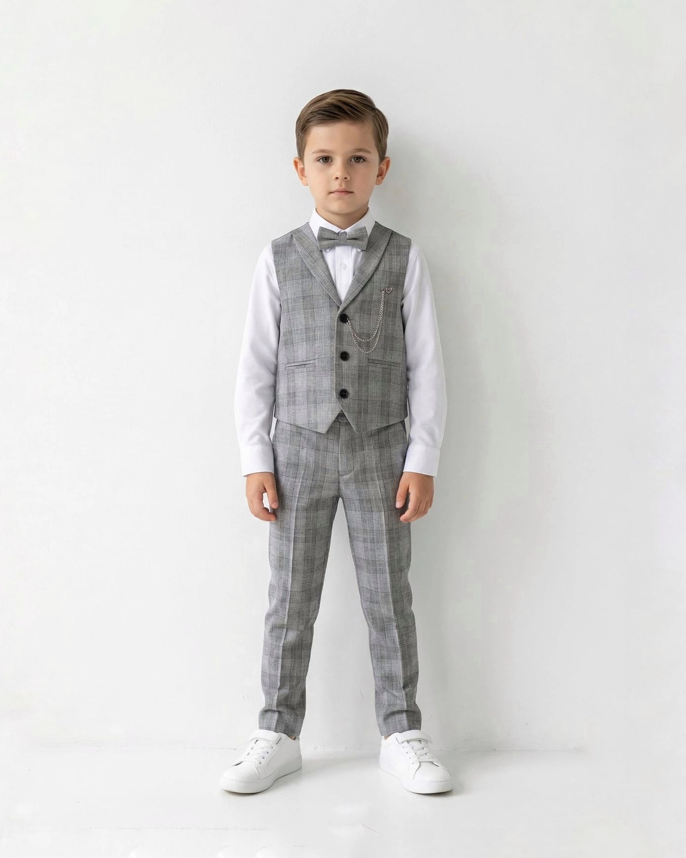 Sivi karirani komplet sa prslukom za bebe i dečake