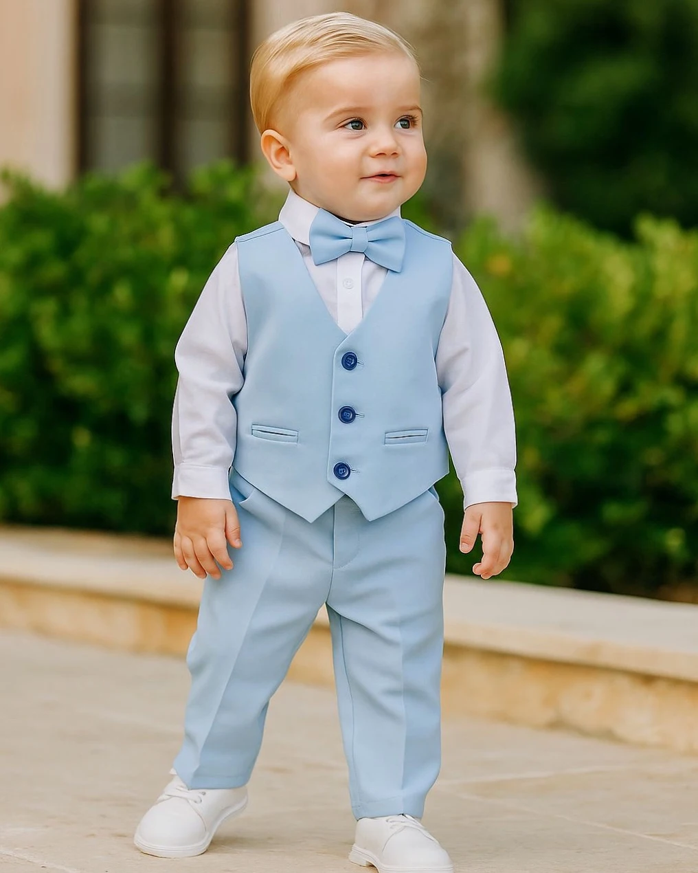 Komplet se sastoji od: prsluka, košulje, pantalona i mašne.